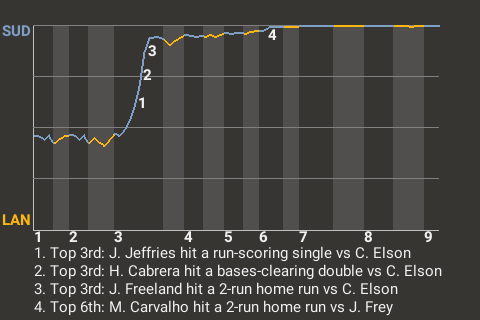 2 (18, 1st Inning off C. Elson, 0 on, 2 outs; 4th Inning off J. Frey, 0 on, 2 outs)