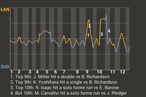 Sudbury got a game-changing hit from Orlando Cuenca. The right fielder blasted a 3-run home run in the bottom of the 12th inning to win the game. It was his only hit in 5 at-bats, but it was a winner.